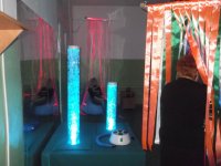 Новшество отделения – это сенсорная комната релаксации. Подобной не было ни в одном помещении «Родника». Здесь в игровой форме детям помогут снять психоэмоциональное напряжение, проведут психокоррекцию. Звездное небо, музыка, гирлянда, удобные кресла – все это создает сказочную атмосферу.